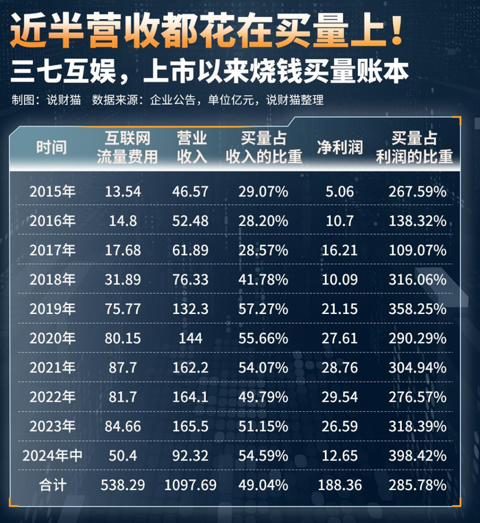 说财猫之前就统计过,过往十年间,三七互娱,光买量就花了 488 亿。