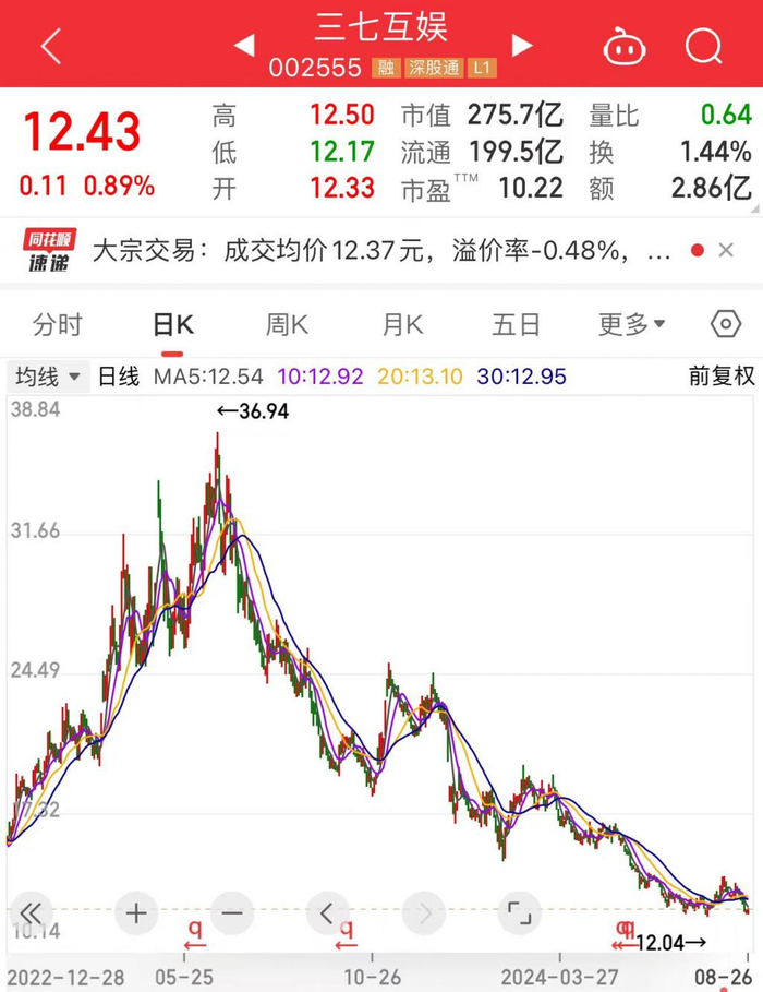 三七互娱的股价,从去年 6 月份,公司董事长和副董事长双双涉嫌信披违规被证监会立案调查开始,就一直跌跌不休。
