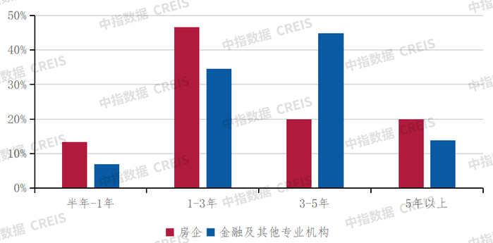 房地产市场企稳预期层面,相较于上半年调查结果,房地产市场企稳预期时间明显延长。五成调查对象认为市场企稳需要3年以上时间,上半年调查这一比例仅为三成左右。从不同类型的机构来看,金融机构调查对象对市场企稳预期的变化更加明显,房企和金融机构认为市场企稳时间需要3年以上的比例分别为40%、60%,而上半年调查中这一数据分别为37%、30%。