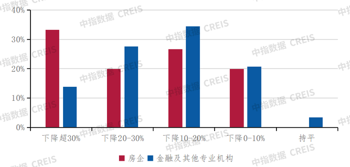 住宅销售层面,调查对象普遍认为2024年全国住宅市场销售面积跌幅将进一步扩大。今年上半年全国新建商品住宅销售面积已下降21.9%,半数调查对象认为2024年全年销售面积同比降幅在20%以内,超七成认为在30%以内。从不同的机构类型来看,房企调查对象相较于金融机构更谨慎,三成房企调查对象认为2024年销售面积降幅可能超过30%。
