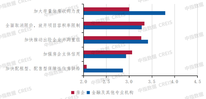 供给端层面,不同类型机构调查对象对政策的期待重点有所不同。房企站在增量市场角度最期待全面取消限价、放开容积率限制等政策,金融机构站在存量市场角度,最期待加大存量住房收购力度,且金融机构在加快配租型、配售型保障性住房供给与加大存量住房收购力度等政策方面的期待度上均远高于房企。