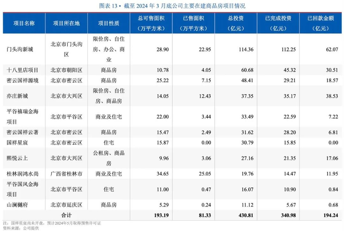 根据一份评级报告显示,截止2024年3月底,在密云,国祥源境项目总可售面积25.22万平方米,已售面积7.15万平方米,总投资48.41亿元,已回款金额18.57亿元;国祥云著项目总可售面积15.47万平方米,已售面积2.49万平方米,总投资31.62亿元,已回款金额6.81亿元。