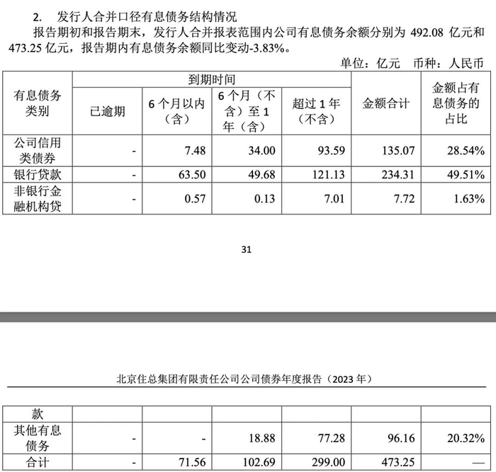报告期末,住总集团合并报表范围内公司有息债务余额为473.25 亿元,其中,公司信用类债券合计为135.07亿元(6个月以内到期7.48亿元,6个月至一年到期34亿元),银行贷款合计为234.31亿元,非银行金融机构贷款合计为7.72亿元。