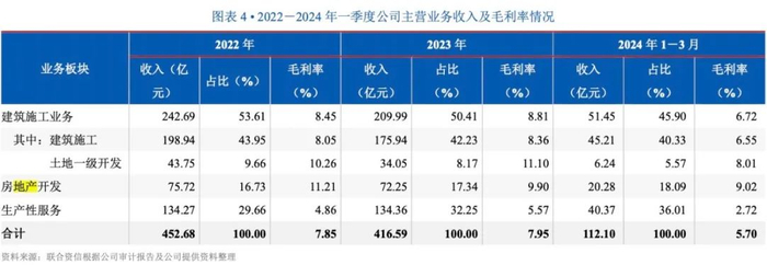 2024年第一季度,住总集团营业总收入112.89亿元,营业总成本111.39亿元,净利润2.52亿元,归属于母公司所有者的净利润2.37亿元。评级报告显示,其中,房地产开发业务的营业收入为20.28亿元,毛利润为9.02%。