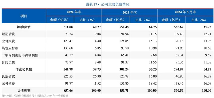 去年末,住总集团流动负债551.48亿元;当中的短期借款、应付票据及一年内到期的非流动负债合计为190.35亿元,期末手持的现金103.9亿元,远低于其流动负债。资产负债率为76.84%,较仍处于较高水平。