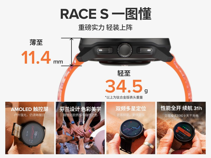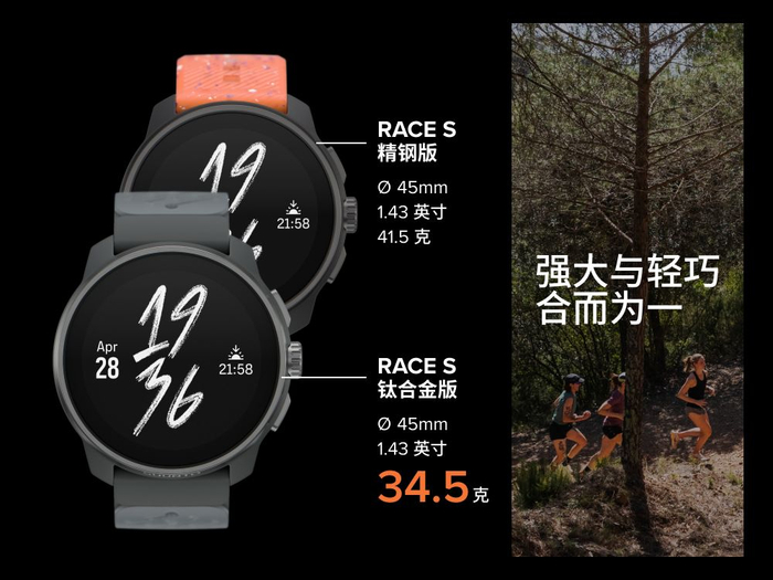 自2024年6月份Suunto Race S精钢版发布以来,就以其小巧精悍、功能强大的特点,受到一众运动爱好者和专业运动员的推崇,这次发布的钛合金版相较于精钢版,延续其相同的强悍性能,但重量更轻,表头仅重34.5g,为户外和越野爱好者带来更舒适无感的佩戴体验,全情投入运动。