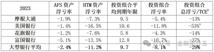 在加息环境下,银行投资组合账面上存在较大浮亏,尤其HTM资产,根据披露的10-Q表,2023年四大商业银行HTM资产的浮亏为-11.2%,而AFS资产的浮亏仅-2.4%。此浮亏还未体现2024年的情形,10年美债收益率2024年内至7月29日升30BPs,按久期为9粗略计算,商业银行投资组合价值将继续下降约-2.7%。