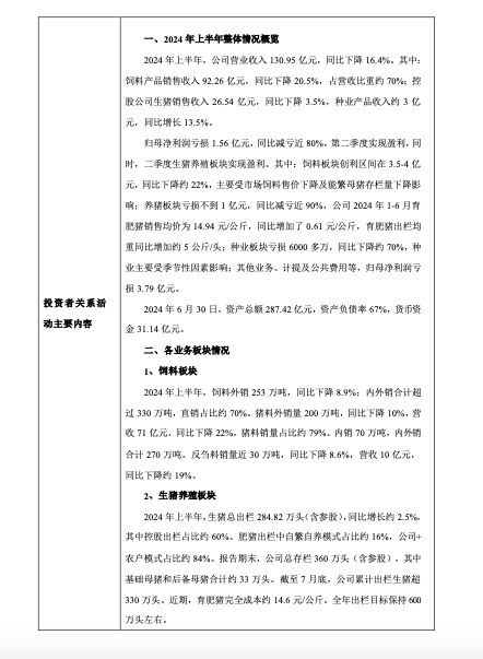 大北农向投资者介绍了2024年上半年整体情况。2024年上半年,公司营业收入130.95亿元,同比下降16.4%。其中:饲料产品销售收入92.26亿元,同比下降20.5%,占营收比重约70%;控股公司生猪销售收入26.54亿元,同比下降3.5%,种业产品收入约3亿元,同比增长13.5%。
