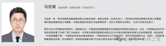 原长城证券监事马伯寅是招商金控的副总经理、首席合规官以及纪委书记。马伯寅1974年出生,拥有博士学位。他在中国保险监督管理委员会任职多年,历任党委组织部处长、青岛监管局副局长等重要职务。2018年9月起,马伯寅加入招商局金融系统,历任招商局金融集团有限公司副总经理、党委委员,招商局金融事业群/平台执行委员会执行委员(常务)、党委委员等职务。2022年9月起,他担任招商局金融控股有限公司副总经理(兼合规负责人)、纪委书记、党委委员,是招商金控的核心高管之一。