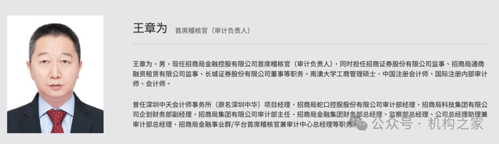 公开资料显示,原长城证券董事王章为是招商金控的首席稽核官,履历显示其拥有丰富的财务和审计经验。1995年至2000年,王章为先生曾在三九集团和深圳中天会计师事务所从事会计和审计工作。随后,他在招商局集团系统内历任多个重要职位,包括招商局集团有限公司审计部主任、招商局金融集团有限公司财务部总经理等。2022年9月起,王章为先生担任招商局金融控股有限公司首席稽核官,位列招商金控高管。