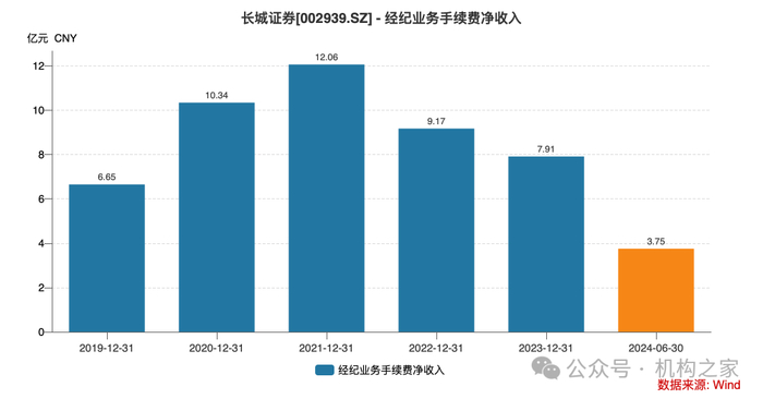 报告期内,经纪业务手续费净收入同比下跌8.14%至3.75亿元,为2020年至今最差半年报表现。其中代理买卖证券净收入2.39亿元,同比下跌4.41%;交易单元席位租赁净收入更是大幅下滑23.57%至0.43亿元。这表明无论是零售经纪业务还是机构经纪业务,长城证券都面临着明显的收入压力。作为长城证券向财富管理转型的关键指标之一,代销金融产品收入虽然同比增长16.82%至0.28亿元,但其绝对数额仍然微不足道,难以有效对冲传统业务的下滑。