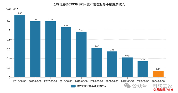 另一值得关注的问题是资产管理业务,其净收入同比骤降58.32%,仅为0.14亿元,创下近十年半年报的最差表现,仅相当于2015年水平的十分之一左右。这一数据的背后,反映的是长城证券在资管新规背景下,主动管理能力的欠缺。