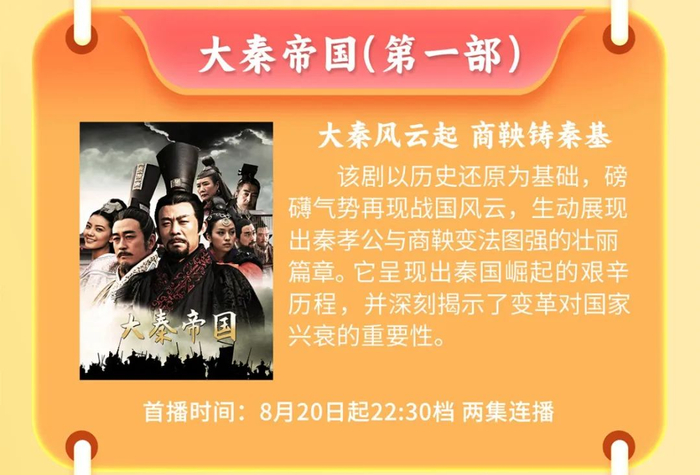 该剧8月20日起在“重温经典”频道播出。让我们跟随该剧导演的视角,体会他饱含激情的创作过程,领略《大秦帝国之裂变》的“大气、爽气、正气”。