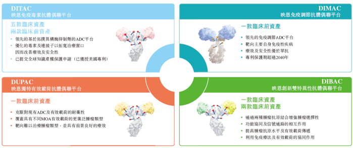 映恩生物打造了四大领先的ADC技术平台,即DITAC(映恩免疫毒素抗体偶联平台)、DIBAC(映恩创新双特异性抗体偶联平台)、DIMAC(映恩免疫调节抗体偶联平台)、DUPAC(映恩独特有效载荷抗体偶联平台),公司已建立由12款自主研发的ADC候选药物组成的极具创新及差异化的管线,包括: