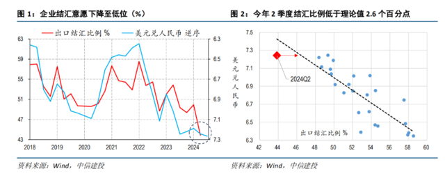 摩根士丹利则表示,截至2024年7月,中国出口商的结汇比例处于历史低点,仅为13.5%。这意味着每收到100美元的出口收入,中国企业仅将13.5美元兑换为人民币。要提高结汇比例,美元兑人民币汇率可能需要降至6.9或6.8的水平,这也取决于美联储的进一步降息行动。