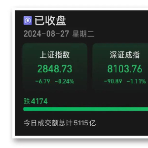 8月27日,市场全天低开低走。截至收盘,沪指跌0.24%,深成指跌1.11%,创业板指跌0.94%。