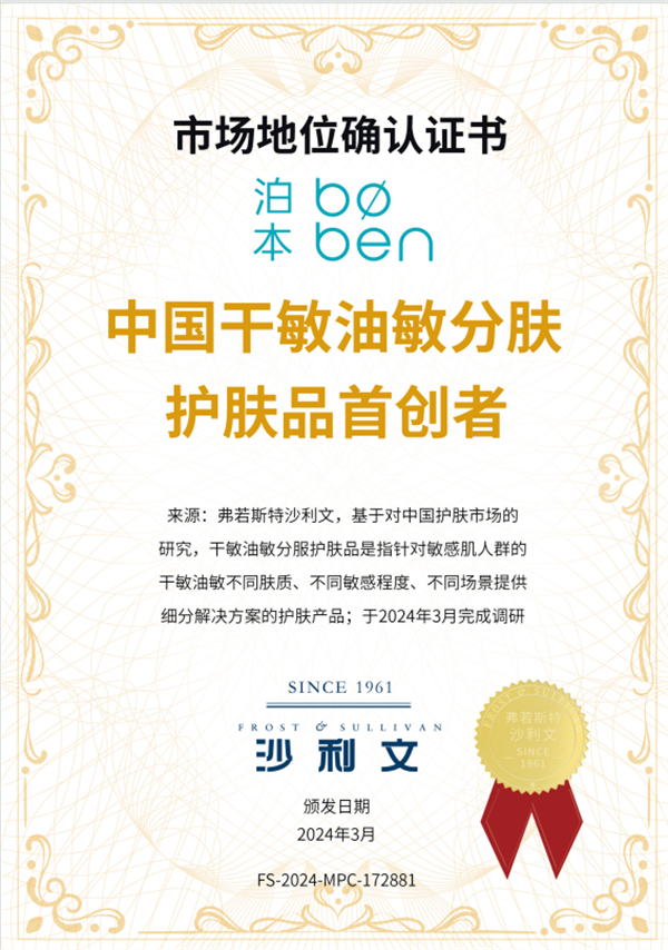 正是这一系列的专业研发和创新实践,使得泊本的产品在市场上获得了广泛的认可和好评。值得一提的是,泊本更是荣获了全球头部战略咨询机构弗若斯特沙利文认证的“中国干敏油敏分肤护肤品首创者”称号。这一认证,不仅是对泊本专业性和高品质的有力证明,更是对品牌声誉的极大加持。