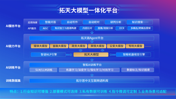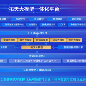 拓尔思拓天大模型是拓尔思融合NLP领域30余年技术积累、10余年高质量数据与知识资产建设经验,以及10000多家企业级用户应用实践打造的多模态大模型产品。