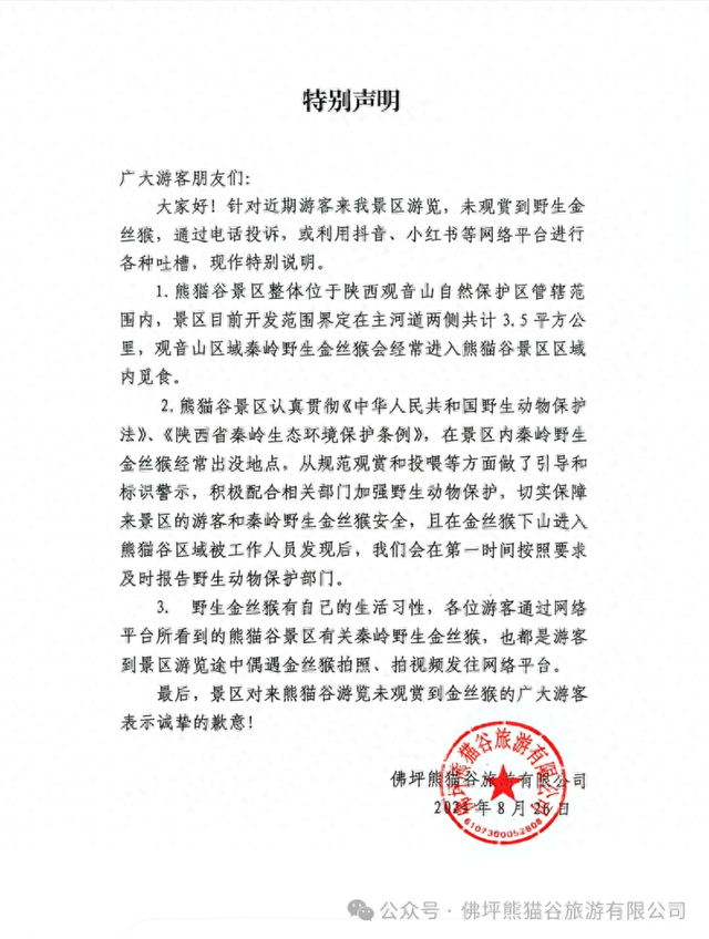 陕西佛坪熊猫谷回应“游客投诉未观赏到野生金丝猴”:野生金丝猴有自己的生活习性 环球网 环球网官方账号 2024.08.2719:32 关注 来源:佛坪熊猫谷旅游有限公司 2024年8月26日,佛坪熊猫谷旅游有限公司发布一则特别声明: