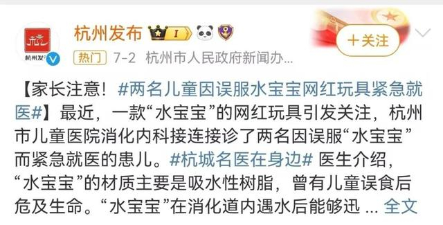 暑假期间,杭州就接连接诊了两名因误服“水宝宝”紧急就医的孩子。