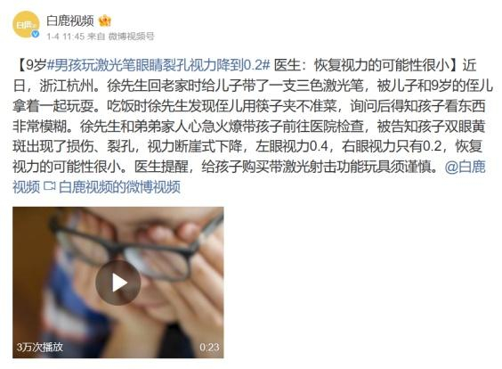 之前有条新闻:杭州一名 9 岁男孩玩激光笔,导致眼睛裂孔视力降到0.2,几乎失明。