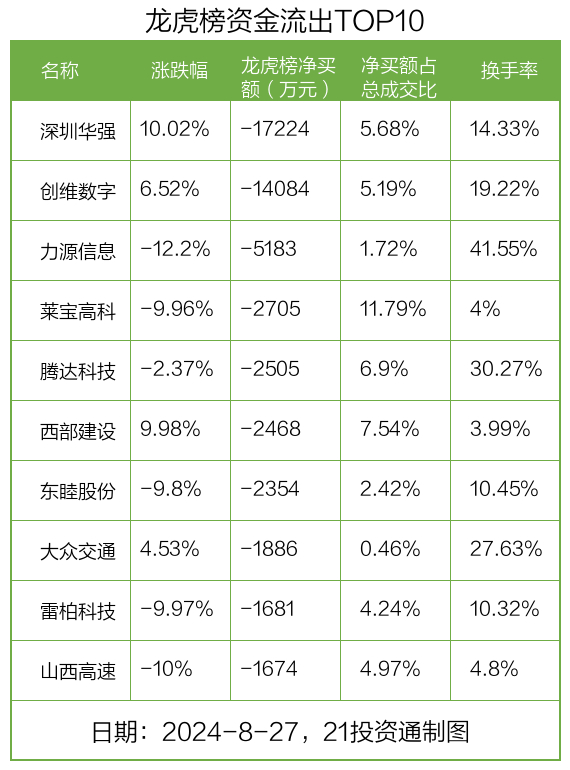 而龙虎榜中资金净流出最多的是深圳华强(000062.SZ),被净卖出为1.72亿元,占总成交金额的5.68%。深圳华强收盘上涨10.02%,换手率为14.33%。