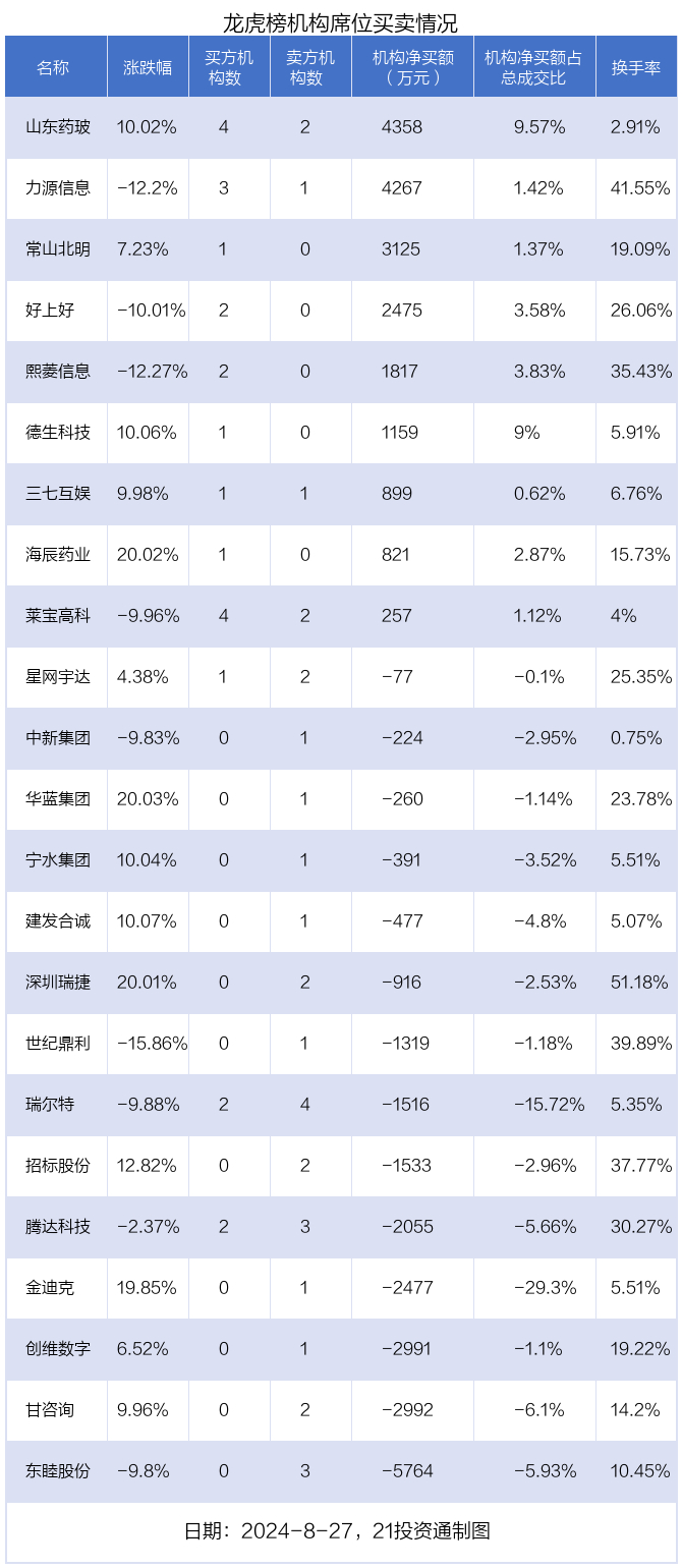 其中,机构净买入金额最多的是山东药玻(600529.SH),当日收盘上涨10.02%,换手率为2.91%。