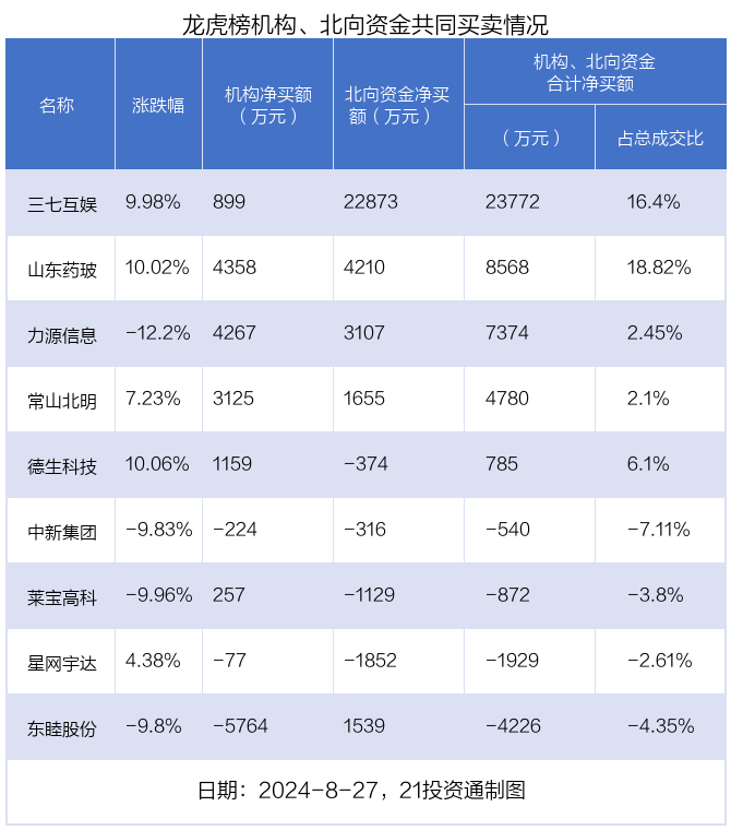值得注意的是,机构和北向资金共同净买入了三七互娱、山东药玻、力源信息、常山北明;共同净卖出了中新集团、星网宇达;在东睦股份、德生科技、莱宝高科上出现分歧,机构净卖出东睦股份5764.4万元,北向资金净买入1538.81万元;机构净买入德生科技1158.85万元,北向资金净卖出373.66万元;机构净买入莱宝高科257.26万元,北向资金净卖出1129.41万元。