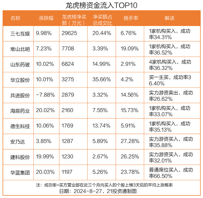 龙虎榜丨2.96亿元资金抢筹三七互娱,机构狂买山东药玻(名单)