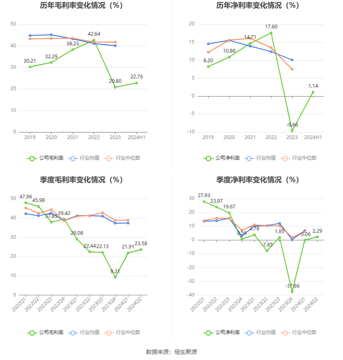 2024年上半年,公司毛利率为22.76%,同比下降2.95个百分点;净利率为1.14%,较上年同期上升3.26个百分点。从单季度指标来看,2024年第二季度公司毛利率为23.58%,同比上升1.14个百分点,环比上升1.67个百分点;净利率为2.29%,较上年同期上升10.14个百分点,较上一季度上升2.35个百分点。