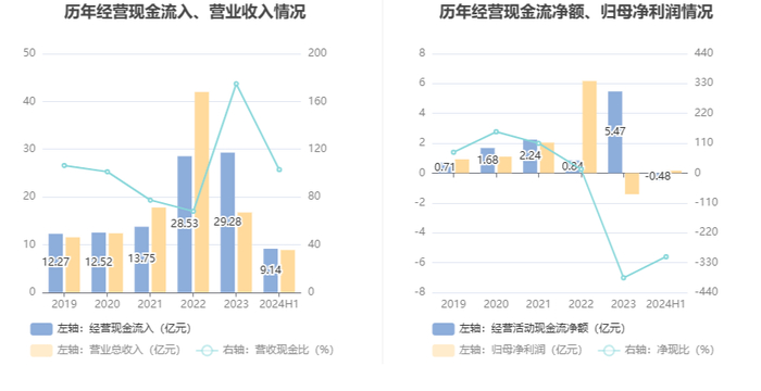 2024年上半年,公司营业收入现金比为102.88%,净现比为-308.62%。