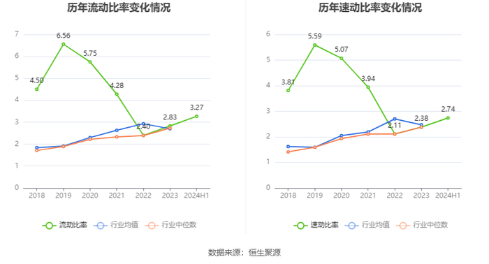 2024年上半年,公司流动比率为3.27,速动比率为2.74。