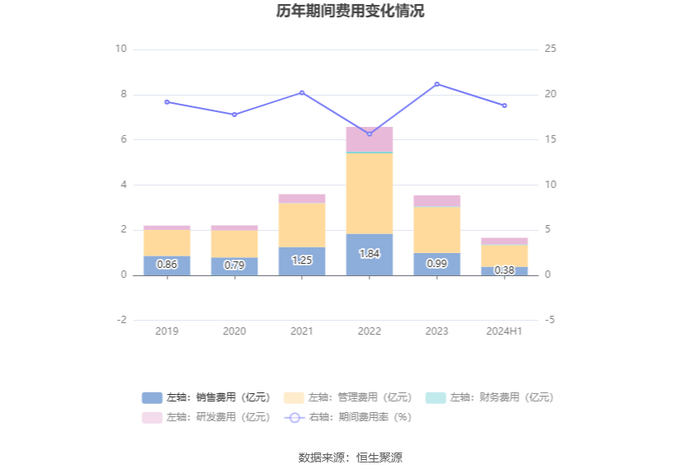 2024年上半年,公司期间费用为1.67亿元,较上年同期增加1011.15万元;期间费用率为18.79%,较上年同期上升0.07个百分点。其中,销售费用同比下降18.52%,管理费用同比增长7.89%,研发费用同比增长50.09%,财务费用同比增长115.39%。