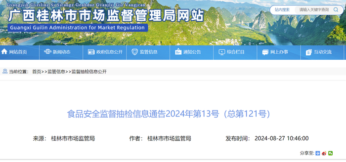 广西桂林市食品安全监督抽检信息通告2024年第13号(总第121号)