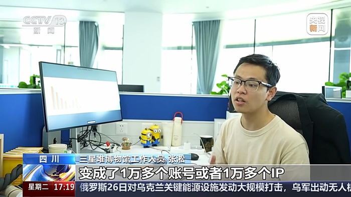 三星堆博物馆工作人员 张淞:他采用模拟IP,我们甚至有一次发现一个账号,模拟了1万多个IP对我们的后台进行访问,实际上就告别了以前的这种一个账号,高频率去刷新票,变成了1万多个账号或者1万多个IP,很低频率地在访问我们的后台系统,我们后台看起来就像是1万多个真人在买票一样。