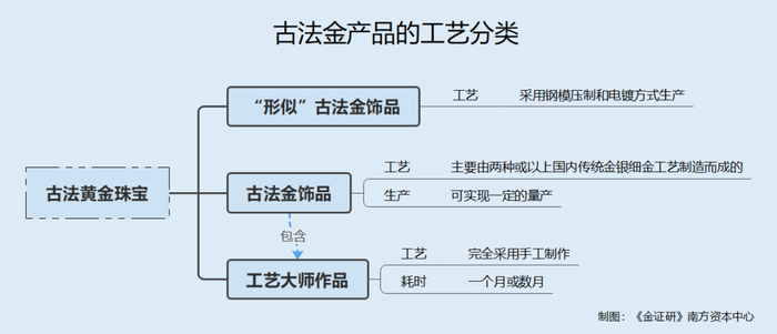 需要指出的是,古法金饰品与工艺大师作品的区别是,工艺大师作品完全采用手工制作,要花1个月或数月的时间才能完成一件,而古法金饰品能够实现一定的量产,从而满足消费者对黄金首饰的高质量需求。