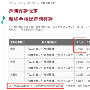 △中银香港官网最新披露港元特优定期存款年利率最高已下调至3.4%