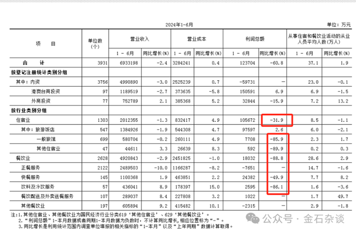根据统计局数据,按行业分确实利润都下滑的比较严重。其中,住宿业下滑31.9%,一般旅馆利润下滑了85.9%;餐饮业总收入下滑2.9%,但利润下滑了88.8%至1.8亿元,快餐服务下滑49.9%至2.44亿,正餐服务直接亏了7651万,饮料冷饮也下滑了86.1%。