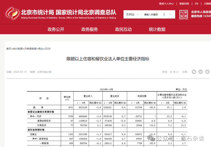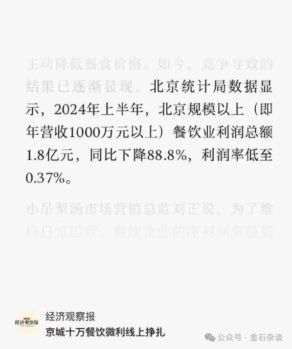 今天,经济观察报的一张截图刷屏全网。北京统计局数据显示,2024年上半年,北京限额以上(年营收1000万以上)餐饮企业利润总额1.8亿元,利润同比下降了88.8%,利润率低至0.37%。