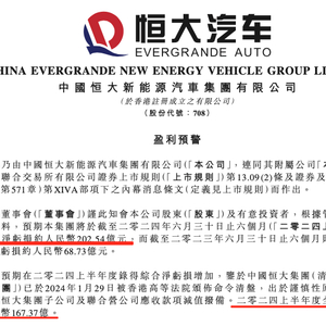 公告表示,预计恒大汽车集团(中国恒大新能源汽车集团有限公司,连同其附属公司)2024年上半年录得综合净亏损约人民币202.54亿元;而去年上半年,则录得综合净亏损约人民币68.73亿元。