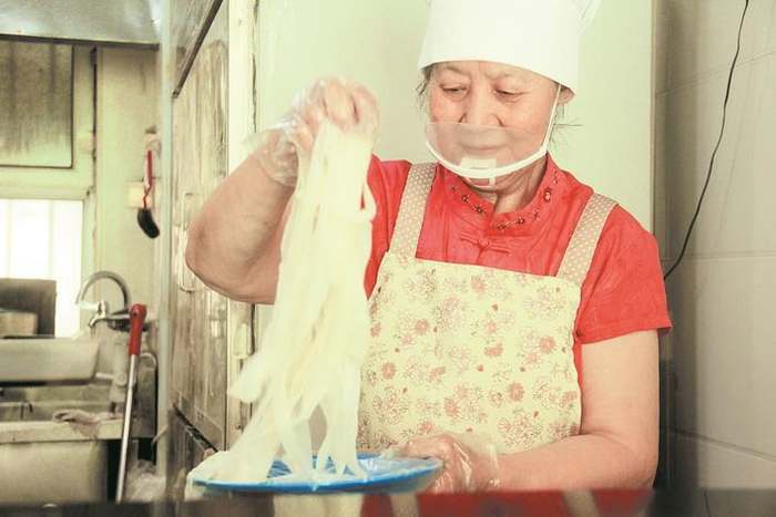每天早晨不到7时,张德兰便来到店里为一天的营生作准备。调面浆、蒸凉皮、烫韭菜、调制料汁……直到天光放亮,才得以休息片刻。30余年来,她几乎日日如此。