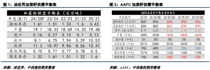 8月25日油世界最新预测下调24/25加菜籽产量预估至1970万吨,调减80万吨左右。虽然同比仍高于23/24年度,但潜在供应压力已经得到一定缓解。值得注意的是,加拿大农业部产量预估仍然偏低,8月维持1862.8万吨的产量判断,与油世界仍维持100万吨以上的差异,给出市场较大博弈空间。