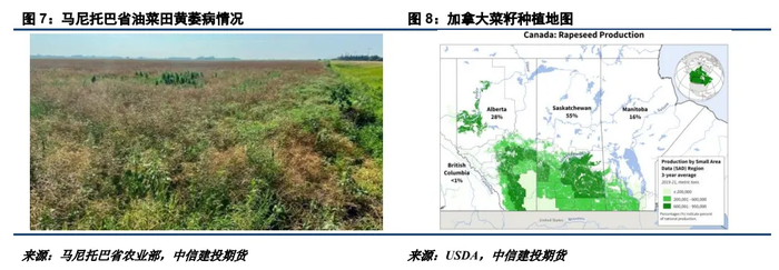 除了降水外,主产区马尼托巴省病虫害报告显示少部分菜籽田出现“黄萎病”现象,虽然从目前来看范围相对有限,但也在一定程度上约束了产量前景。三省综合来看,阿尔伯塔省受到偏少降雨和前期火宅影响的程度最高,产量前景偏弱,萨斯喀彻温省整体无太大问题,但降雨也偏弱,马尼托巴省相对乐观,不过产量占比相对有限。