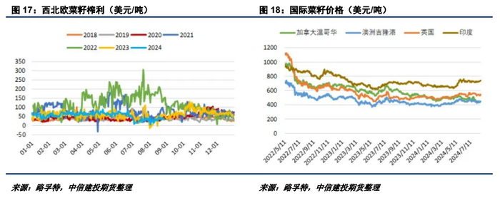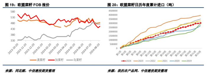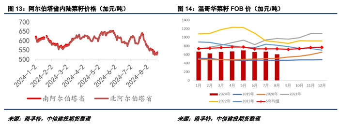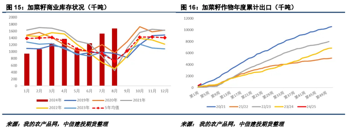 然而,近期加拿大的工人活动形势有可能导致菜籽内陆销售压力增大。24年8月23日,加拿大油菜籽理事会、油菜籽种植者协会和油籽加工者协会联合发起“Stop The Strike”活动,希望加拿大国家铁路公司、油菜籽公司和卡车司机工会尽快恢复铁路服务。若工人活动持续,可能使得新季菜籽堆积,导致库存增加,从而对加拿大本国菜籽价格形成打压。