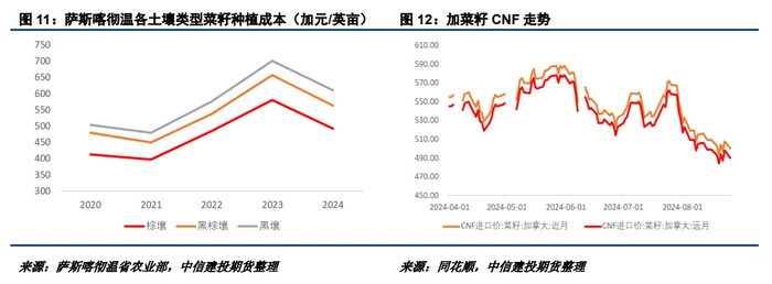 加菜籽是否被低估了呢?按照萨斯喀彻温省本年度的Crop Guide来看,其棕壤/黑棕壤/黑壤菜籽种植成本分别为493.11/563.69/610.22加元/英亩,将单位换算成加元/公顷,按照目前AAFC2.12吨/公顷的单产和0.74左右的汇率水平换算,我们认为萨省菜籽种植成本在435-520美元/吨左右。取黑棕壤作为代表性土壤,我们认为目前种植成本实际在485美元/吨左右。目前加菜籽CNF报价仍在490美元/吨以上,但已经十分靠近成本线。