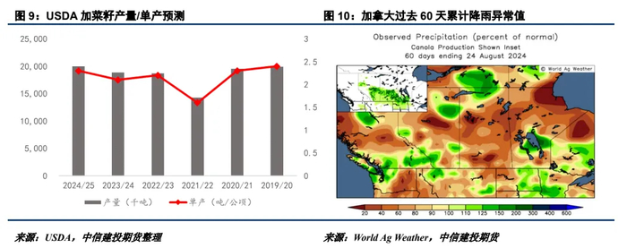 除了萨斯喀彻温省之外,另一个主产区阿尔伯塔省自7月中旬以来不断下调优良率评估,并在最新的作物报告中预测其菜籽单产为34.2蒲式耳/英亩,虽然优于2023年同期,但仍低于2022年水平。作物报告还显示,截至8月20日,阿尔伯塔省全省有26.9%的土壤处于糟糕状态,高于5年均值水平22.6%。简而言之,7-8月降水不足约束了本年度主产区菜籽单产水平。