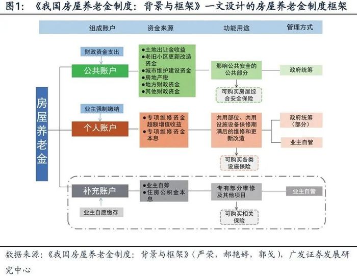 全国人大代表佘才高建议[5]:“房屋养老金实行分类管理,由公共账户和个人账户两部分组成”、“公共账户资金来源主要是土地出让金、维修资金增值收益结余、老旧小区改造资金、三供一业移交应归集的资金、城市物业管理奖补资金等等……主要用于房屋日常强制体检、购买房屋安全综合保险等公共服务”、“个人账户是指住宅专项维修资金账户,主要用于保修期满后住宅共用部位和共用设施设备维修和更新改造。”