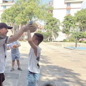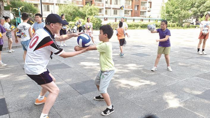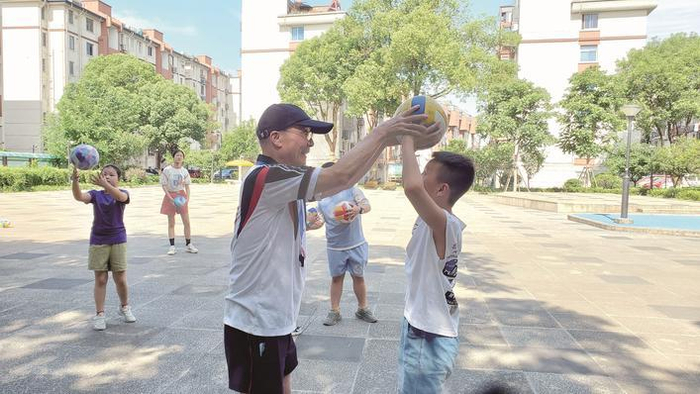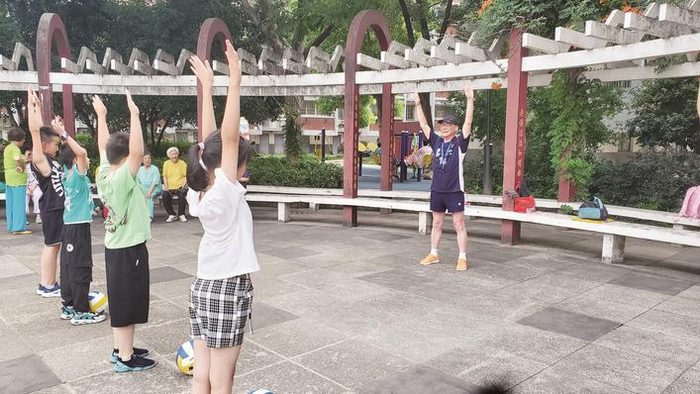 今年夏天,一次偶然的机会,杨志冠在中兴苑广场上溜达,看到有小朋友拿着排球当足球踢。当时他脑海中闪过一个念头:“我是不是可以教社区的孩子们排球呢?他们上培训班的话还要一节课80元、100收费的,我免费教!”