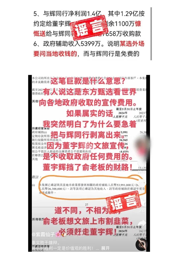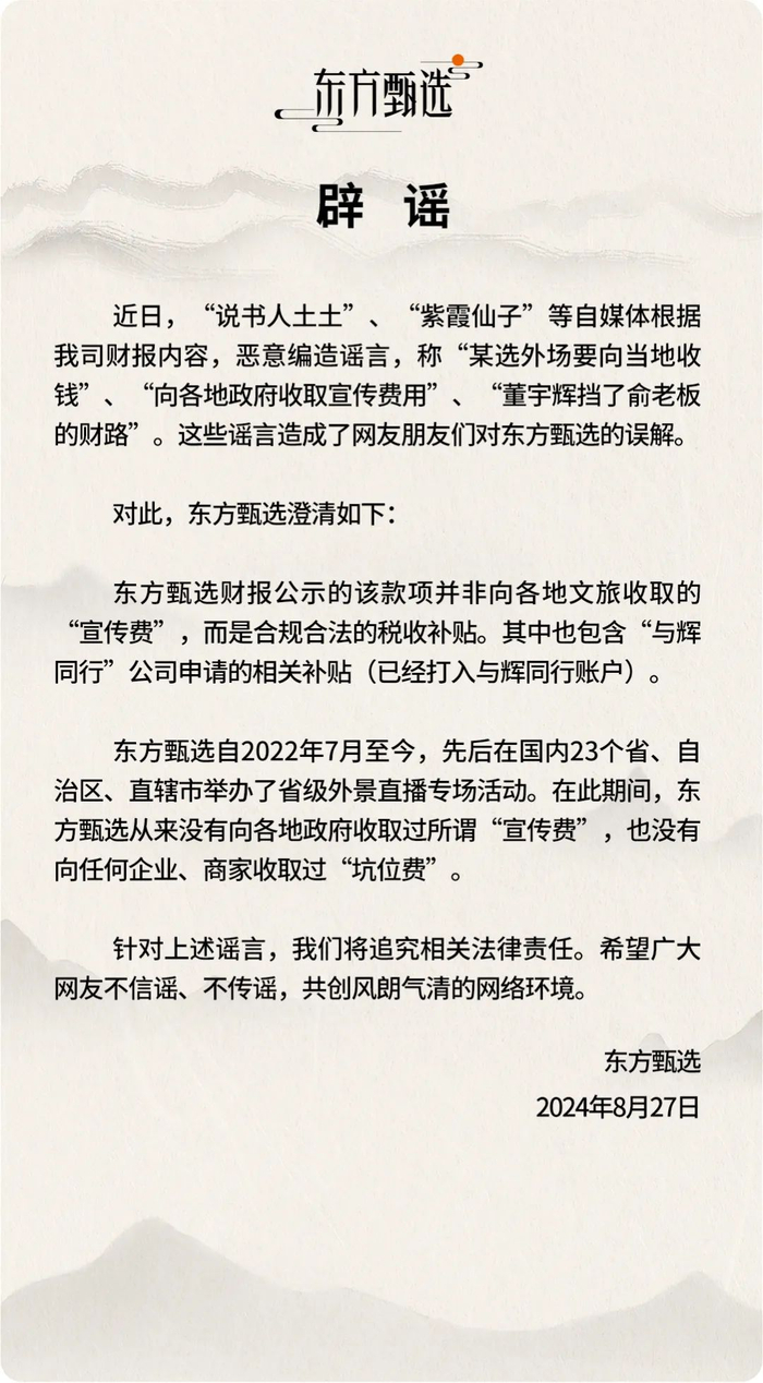 8月27日晚间,东方甄选再发文辟谣:近日,“说书人土土”、“紫霞仙子”等自媒体根据东方甄选财报内容,恶意编造谣言,称“某选外场要向当地收钱”、“向各地政府收取宣传费用”、“董宇辉挡了俞老板的财路”。这些谣言造成了网友朋友们对东方甄选的误解。