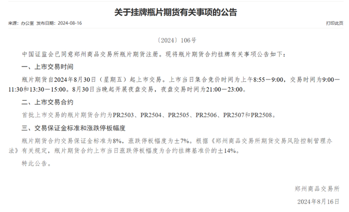 此外,为做好瓶片期货上市准备工作,郑商所同期还发布了《郑州商品交易所瓶片期货合约》《郑州商品交易所瓶级聚酯切片期货业务细则》、关于征集瓶片期货交割品牌和免检品牌、关于征集瓶片期货指定交割仓(厂)库、关于瓶片期货手续费收取标准等公告。